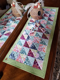 It's a big ol' table runner made with batik scraps in a log-cabin-ish diamond.